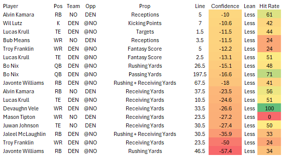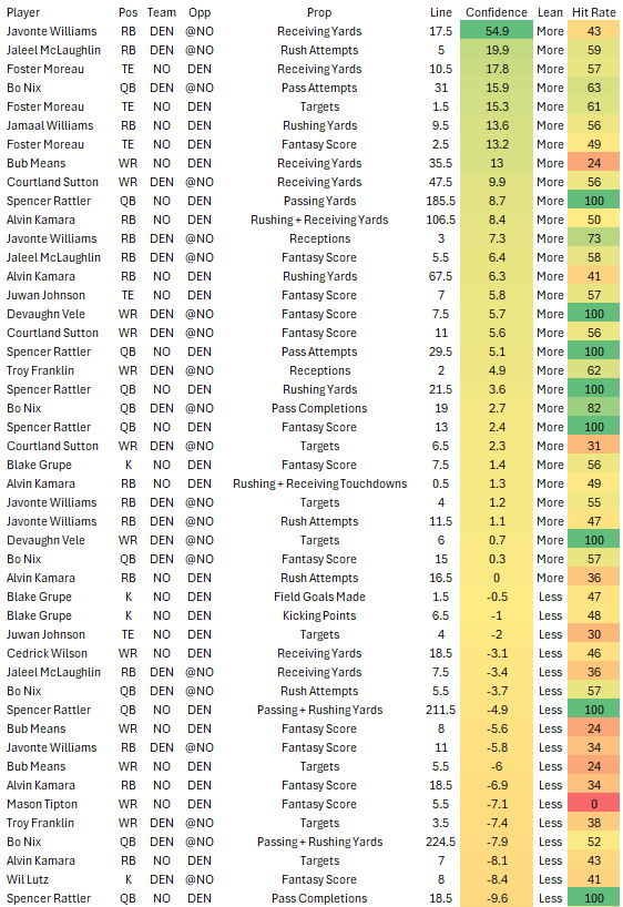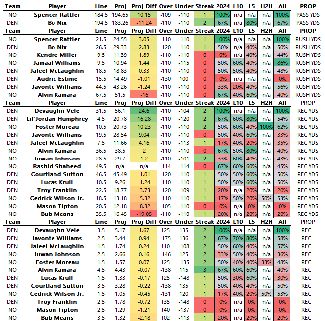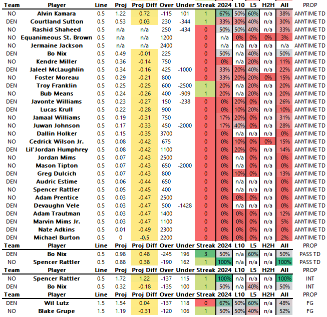 Bo Nix 1+ INT -135 (Popular play is targeting Rattler here but i’m going with Nix. While DEN DEF has 5 INTs on the year, the Saints already have 10, 2nd most in the league. DEN pass play percentage on the year is 57.15%.