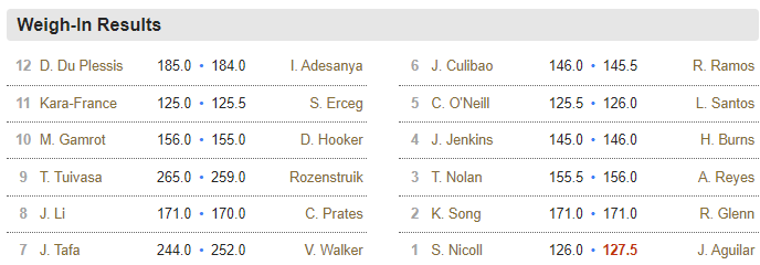 Aguilar the only fighter to miss weight. Regardless, this is Nicoll’s coming out party and his versatility and ability to switch things up in there should put him in position for a choke, and at the very least a decision.