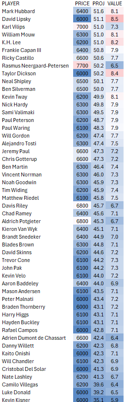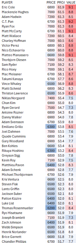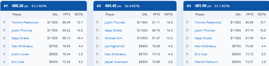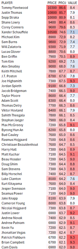 Tommy Fleetwood Top 20 -165 (Top DFS projection is Fleetwood, and he drew early/late tee time. Has finished 16th or better in two career starts)