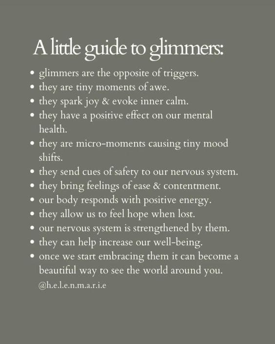 I thought that I had come up with this all on my own, but I have never once had an original thought in this, the Age of the Internet. So if you want more resources on glimmers, I will link some below. I’d be curious what you find!